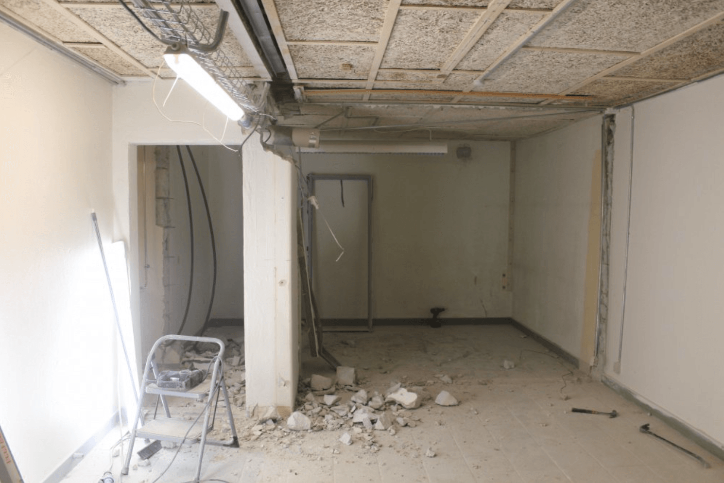 Der blev revet vægge ned, så vi kunne slå nogle af rummene sammen, og derved få bedre udnyttelse af kvadratmeterne (7/8-2015).