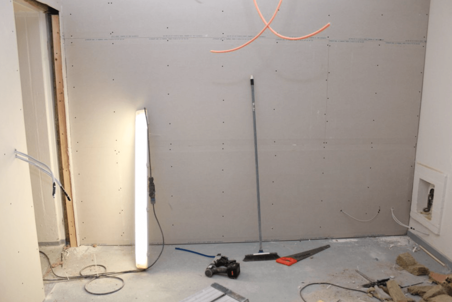 En del af væggenes lydisolering består af tre lag gips, et lag mineraluld samt et mellemrum, der hindrer koblingseffekten (23/9-2015).